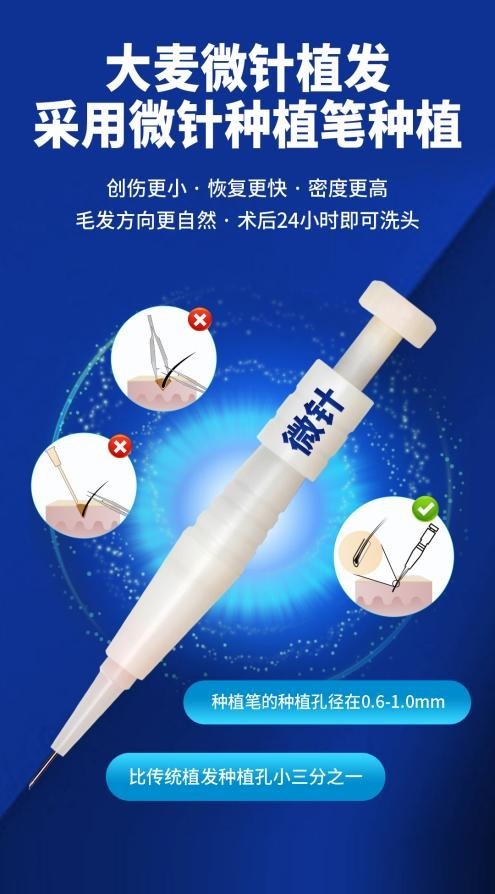 而当毛囊完全闭合形成光裸区时,药物和养护均无法起效,植发成为唯一有效解决方案,大麦微针植发采用国际公认的主流微针植发技术,又称微针种植笔技术,其核心优势在于创伤更小、恢复更快——微针种植笔直径仅0.6-1.0毫米,创口比传统技术小三分之一,术中出血少、术后肿胀轻,最快24小时即可洗头,同时种植密度比传统技术提升20%-30%,且种植笔可360度旋转,能精准模拟原生发生长方向和角度,术后效果自然无痕。