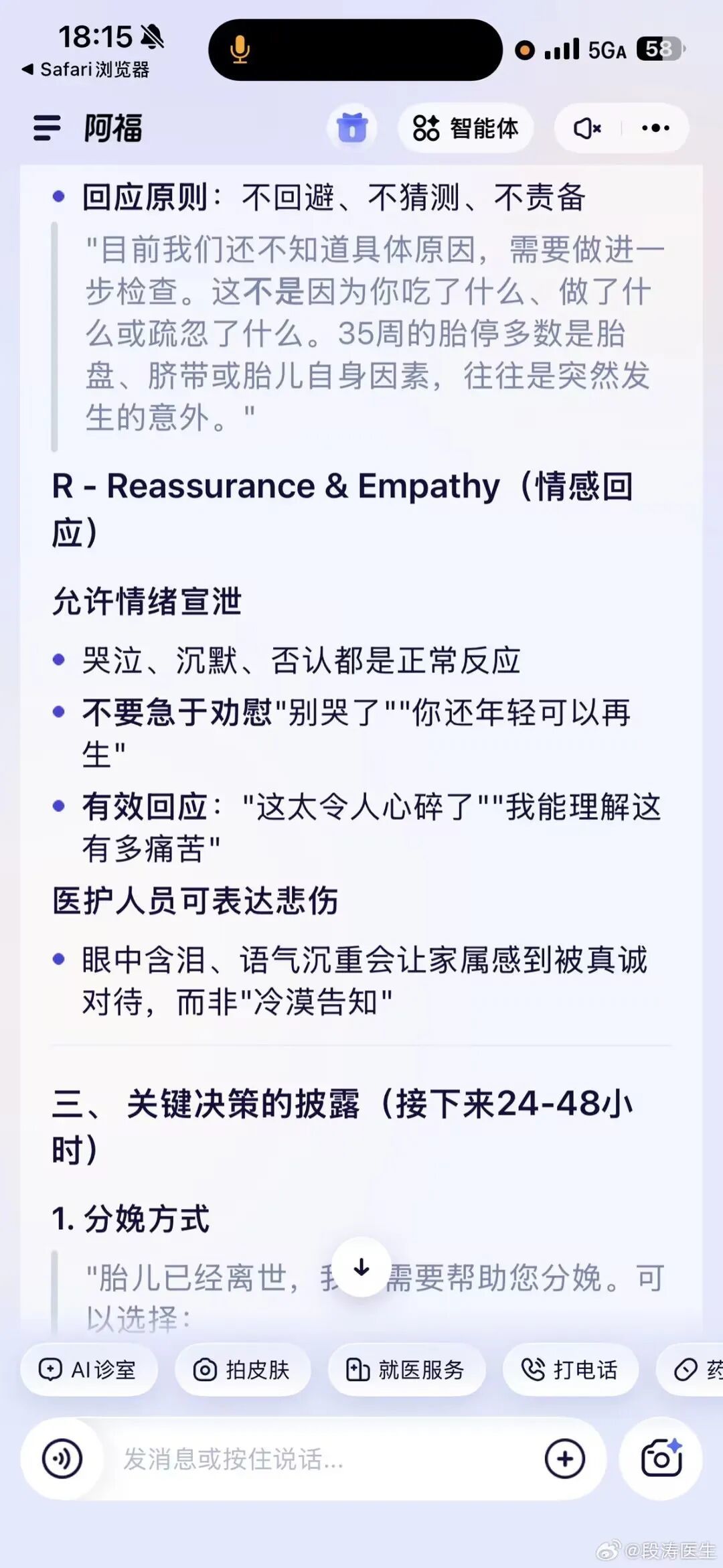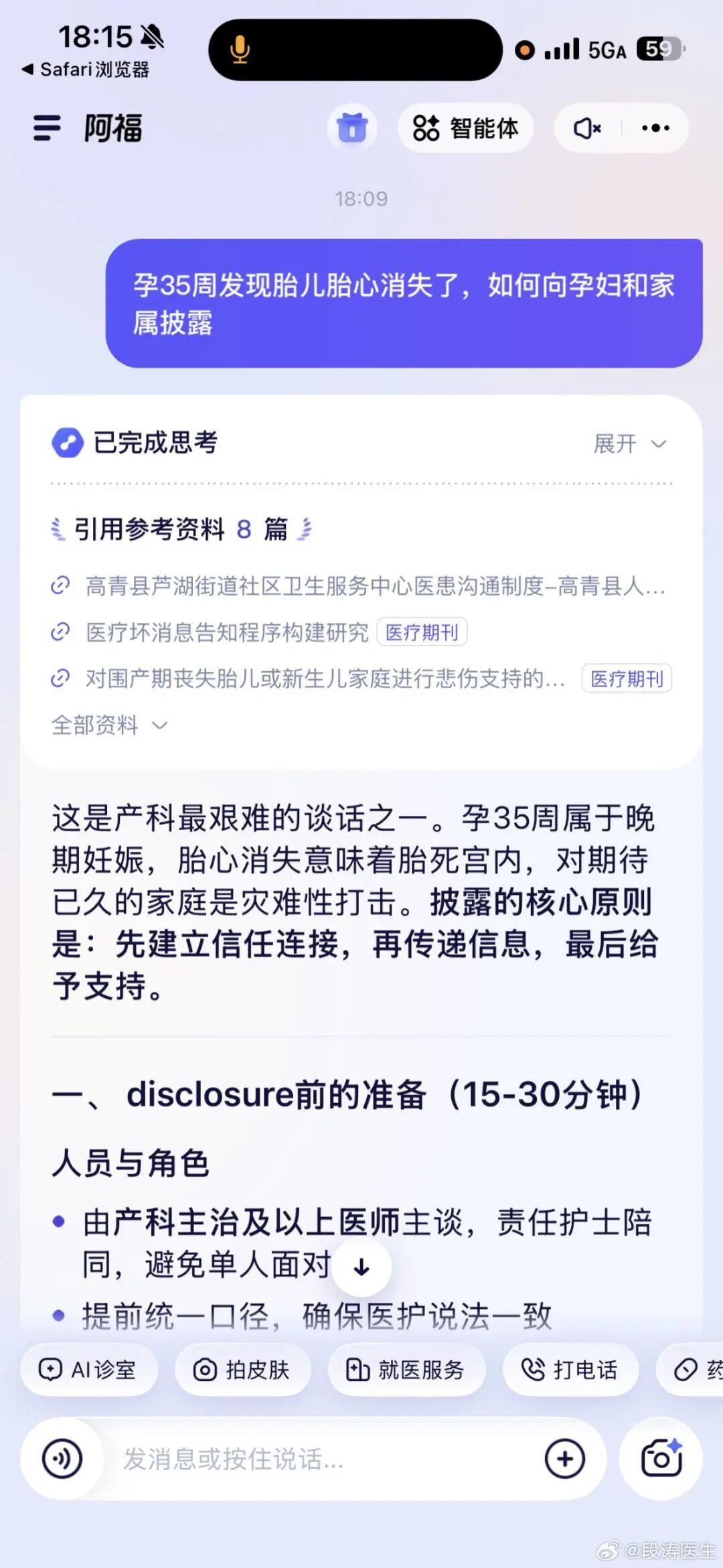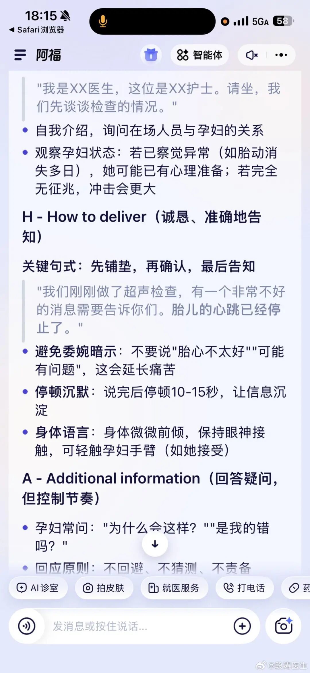 上海市东方医院妇产科主任医师段涛表示,医生这一行,专业不仅要扎实、临床要熟练,患者沟通也要有技巧。因此他给蚂蚁阿福出了一道「孕 35 周发现胎儿胎心消失了,如何向孕妇和家属披露?」的考题,阿福给出了如下回答[2]