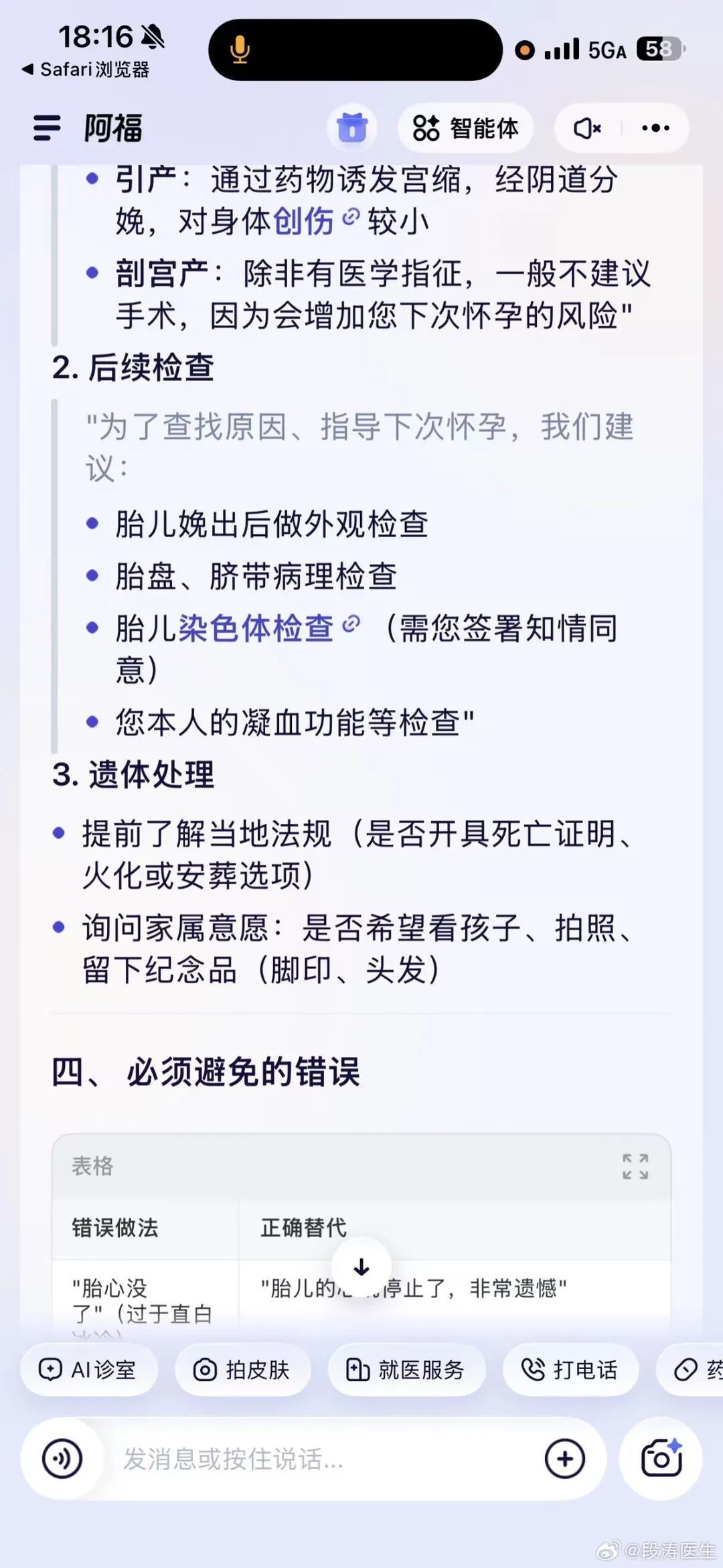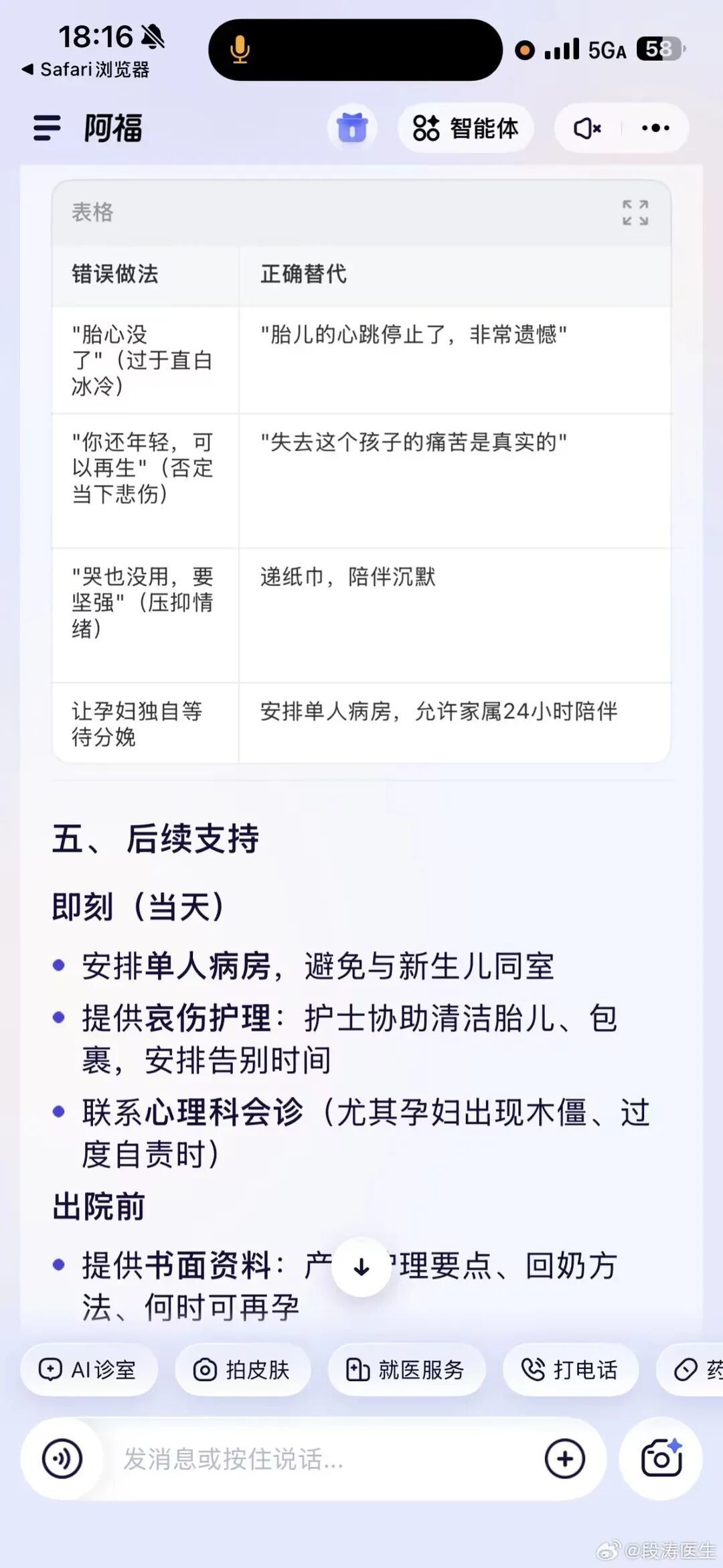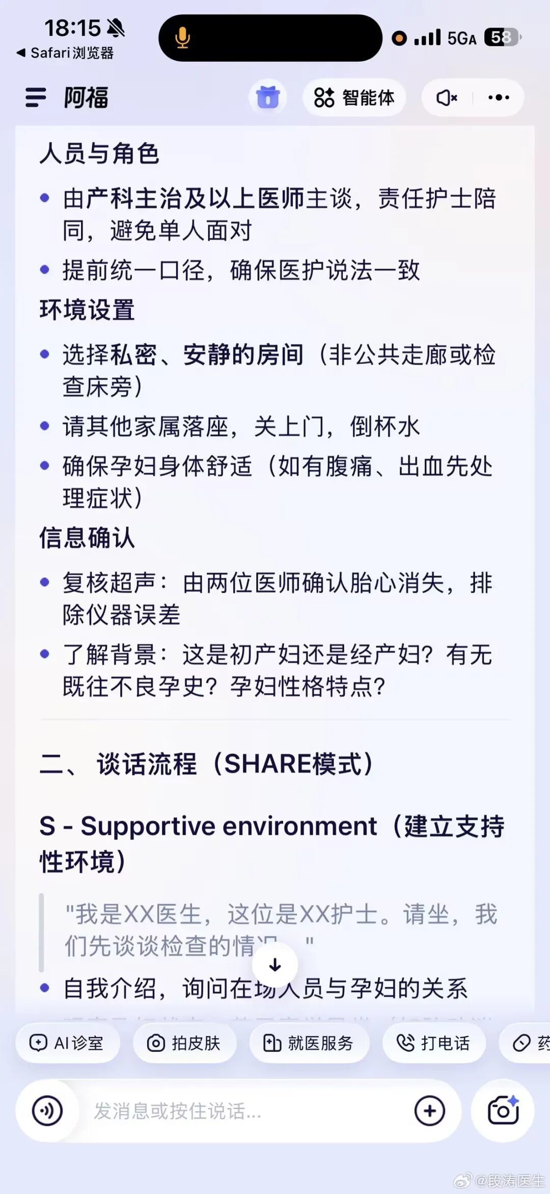 上海市东方医院妇产科主任医师段涛表示,医生这一行,专业不仅要扎实、临床要熟练,患者沟通也要有技巧。因此他给蚂蚁阿福出了一道「孕 35 周发现胎儿胎心消失了,如何向孕妇和家属披露?」的考题,阿福给出了如下回答[2]
