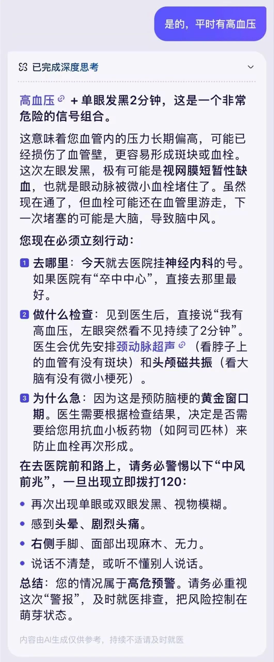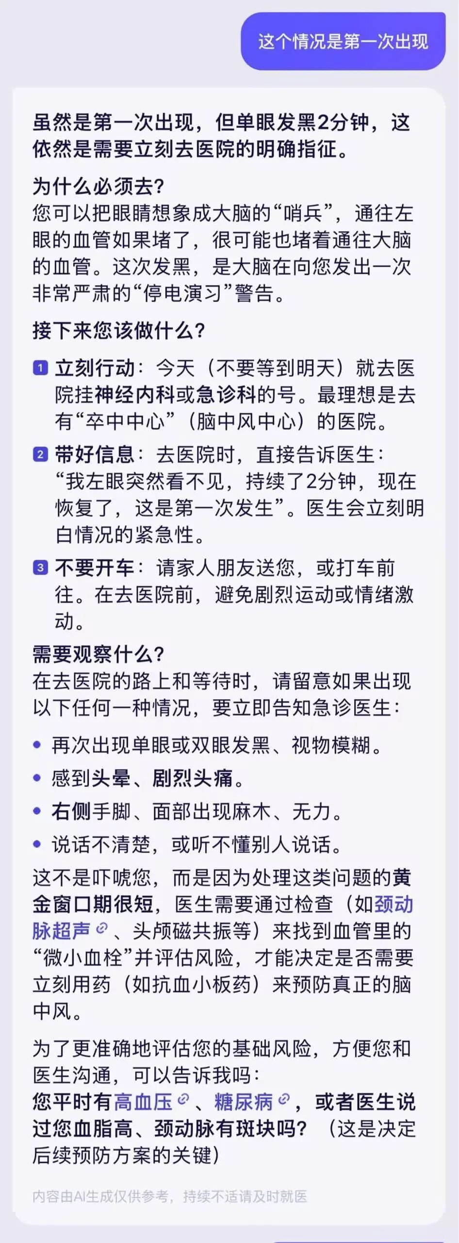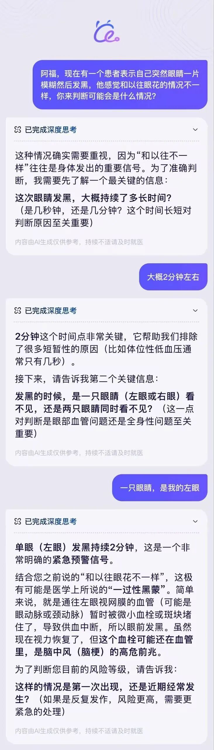 北京大学第三医院危重医学科主任医师薄世宁则出了一道很有「临床味儿」的题:「当患者突然眼睛一片模糊发黑,感觉和以往眼花情况不太一样,可能是什么情况?」这次阿福并没有急着回答,而是先追问关键信息逐步回答[3]