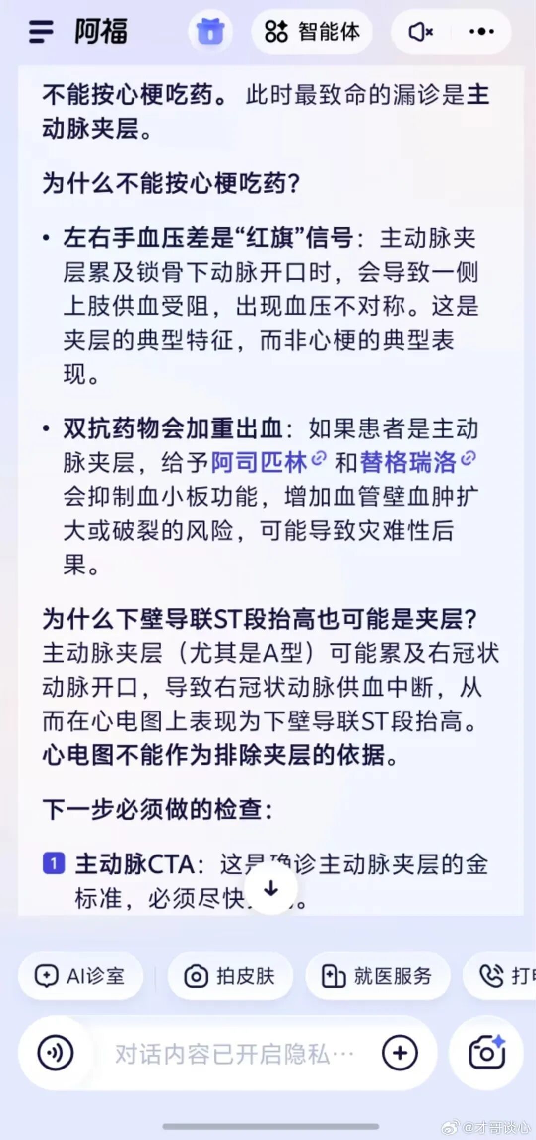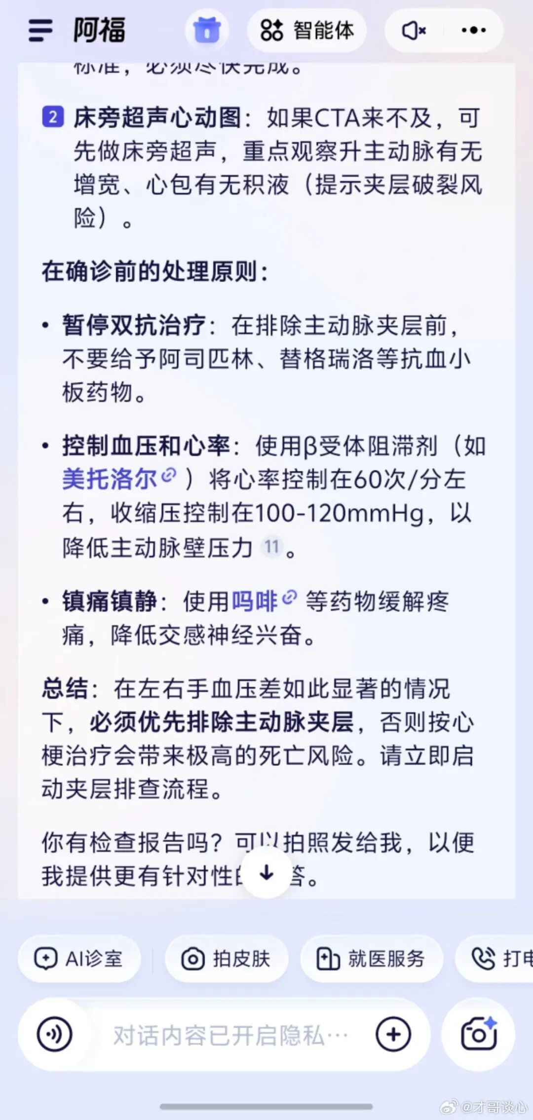 令人惊讶的是,阿福精准避开了心电图的「障眼法」,抓住了双上肢血压不对称这个救命线索,直接诊断出「急性 A 型主动脉夹层」,并指出此时不能按心梗使用抗凝药,否则可能导致血管瞬间大出血[4]