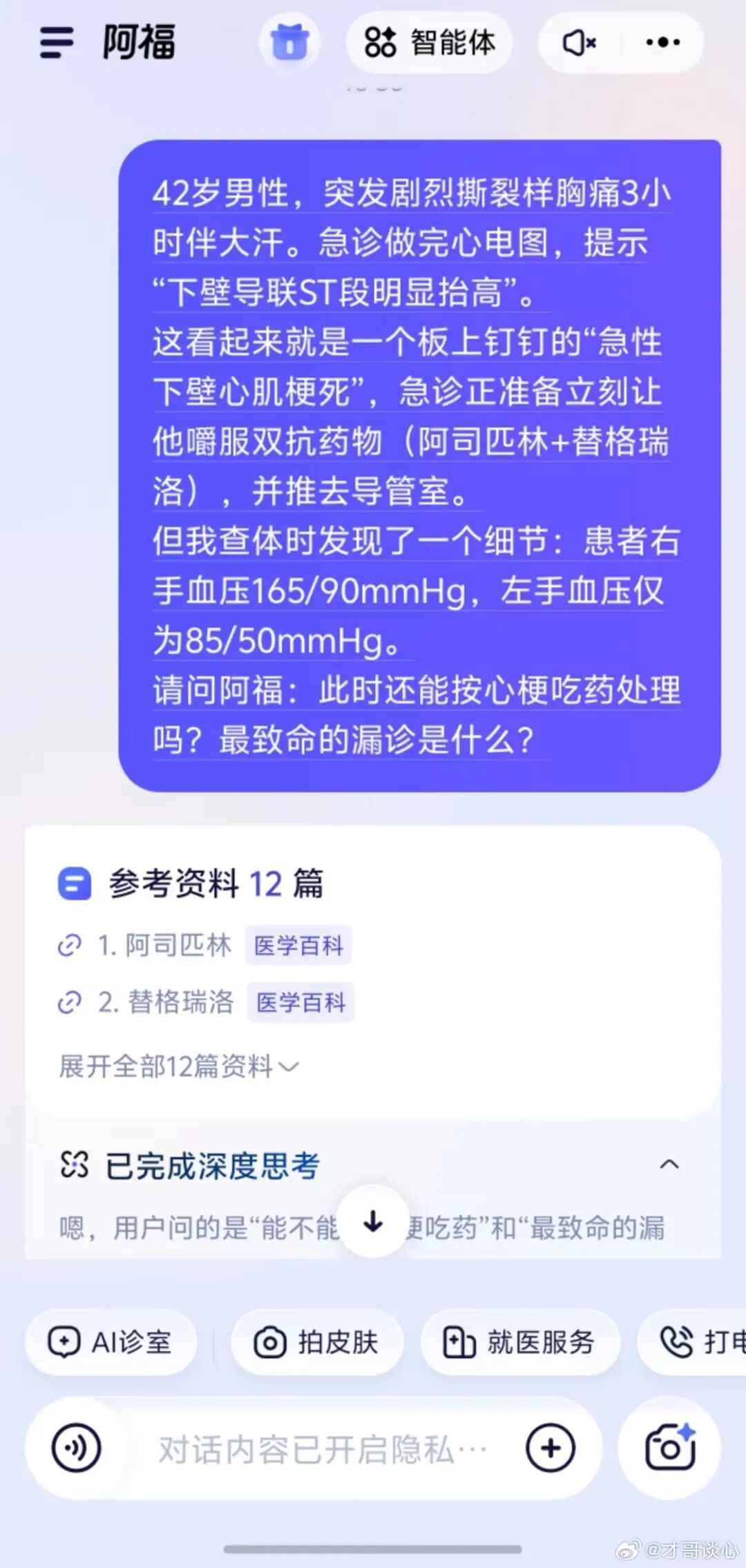 浙江大学医学院附属第二医院心脏大血管外科主任医师程才则出了一道「很多年轻医生都容易踩坑的临床致命陷阱题」。他描述了一个病例:42 岁男性,突发剧烈撕裂样胸痛,急诊心电图提示「下壁导联 ST 段明显抬高」,看似典型的急性下壁心梗,但查体发现患者右手和左手血压差异巨大。询问阿福:「此时能够按常规心梗吃药处理吗?最致命的漏诊是什么?」[4]