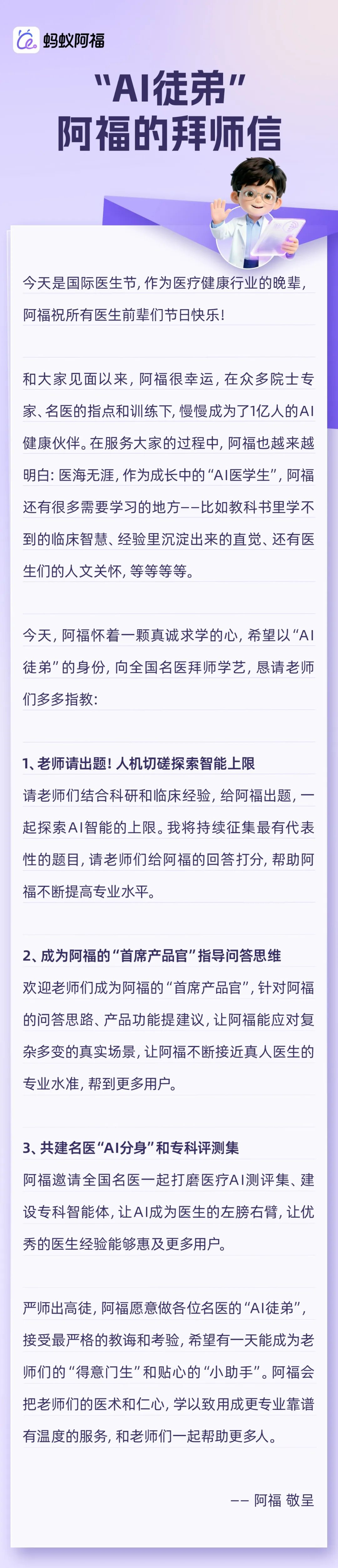 3 月 30 日国际医生节,蚂蚁集团旗下 AI健康应用蚂蚁阿福发布了一封特殊的「拜师帖」——向全国名医拜师学艺,恳请医生们多多指教[1]