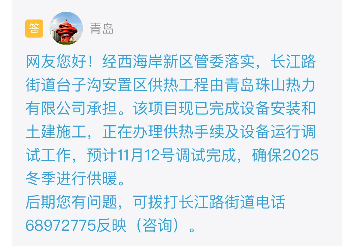 收到留言后,青岛市进行了办理并回复:经西海岸新区管委落实,长江路街道台子沟安置区供热工程由青岛珠山热力有限公司承担。该项目现已完成设备安装和土建施工,正在办理供热手续及设备运行调试工作,预计11月12号调试完成,确保2025冬季进行供暖。