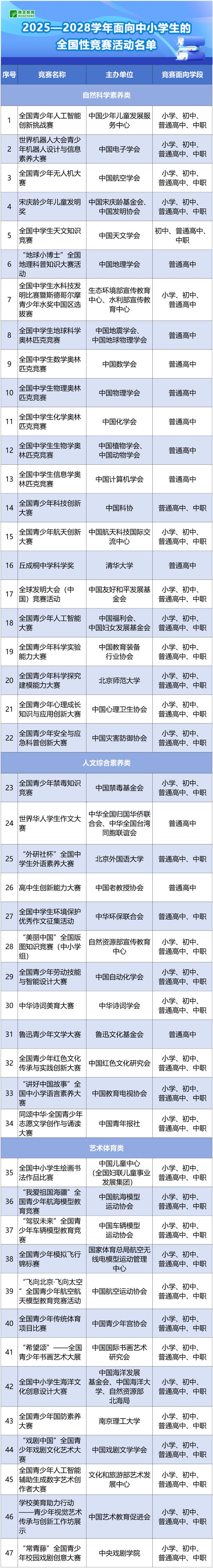 教育部近日印发通知,确定47项竞赛活动为2025—2028学年面向中小学生的全国性竞赛活动。一起看名单——